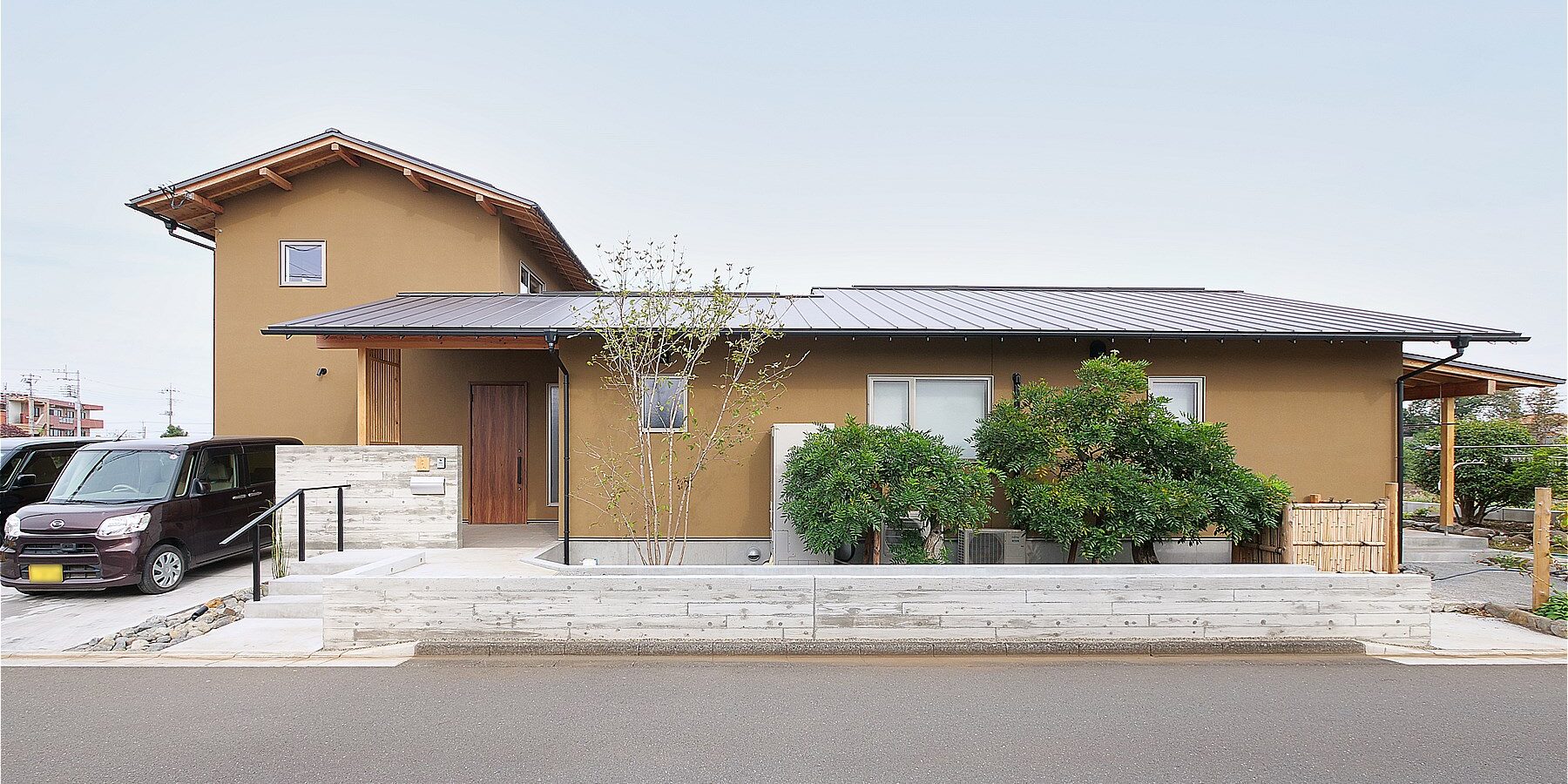 - 道路側に平屋を建てることで、2つの庭に外部からの視線が入ってこないよう囲い込み、また建物の圧迫感をできるだけ抑えるように配慮しました。