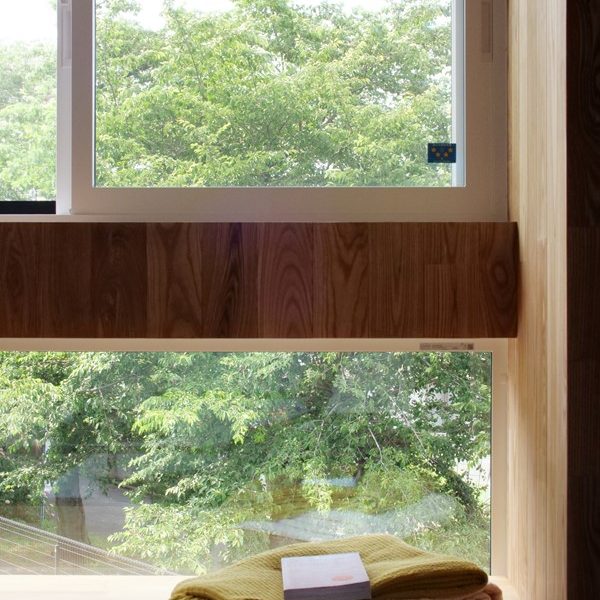 - 窓から臨む桜並木の借景。趣を損なわないように木材で窓枠兼棚を造作。
