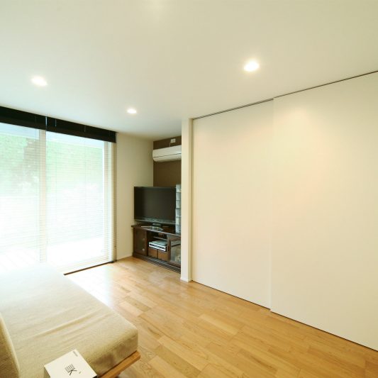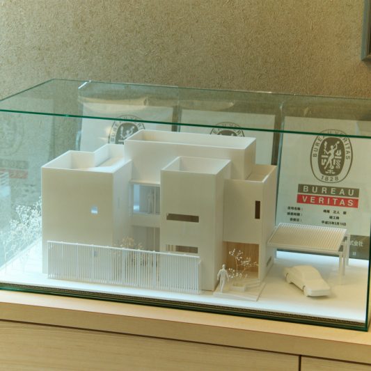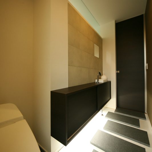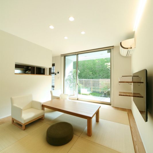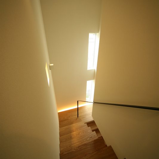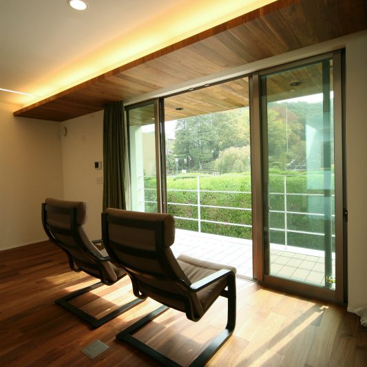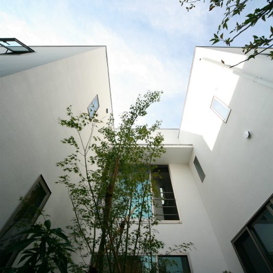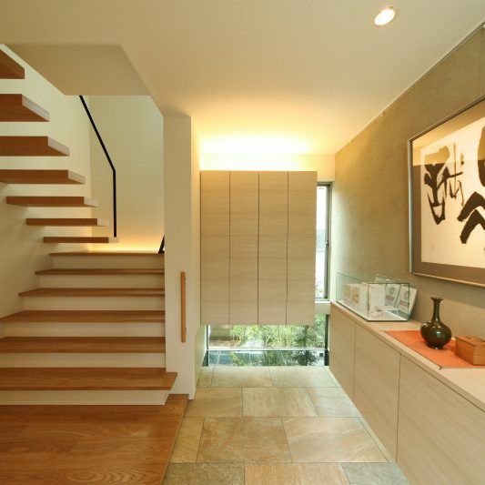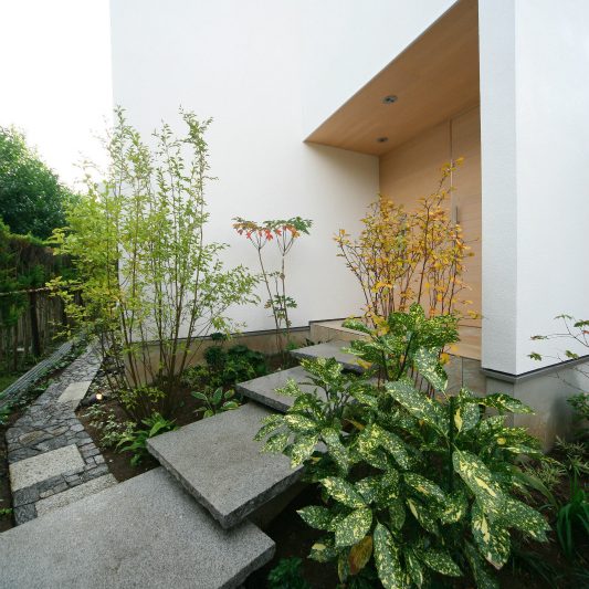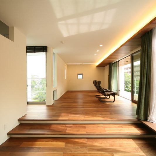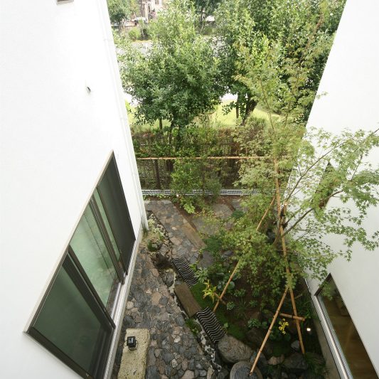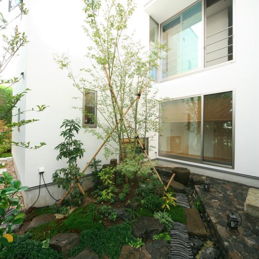 隣が公園であり、周囲を高い木に囲まれているため、開放感のある広い窓を有しつつも、プライバシーは守られています。中庭にも緑を取り入れ、石を多用することで日本伝統の箱庭を表現しました。スクエアをうまく組み合わせることで、スペースを効率的に使用し、LDKを広く確保しています。1階を親世帯、2階を子世帯が使用する2世帯住宅であるため採光を上手くとることで空間につながりを持たせて、家族の気配を感じられる空間に仕上がりました。