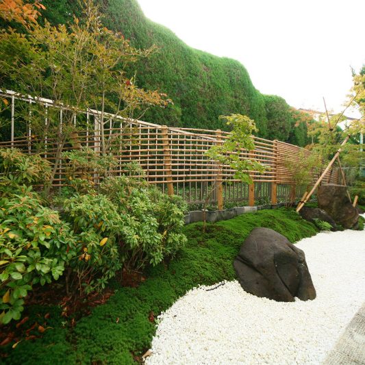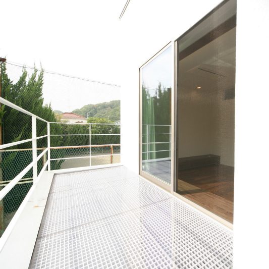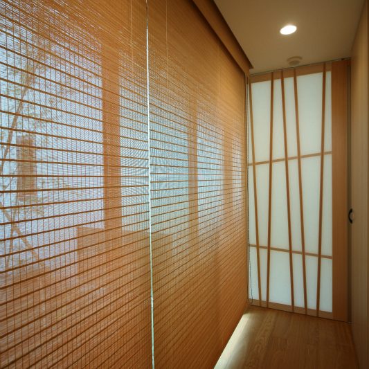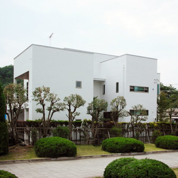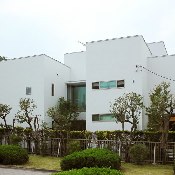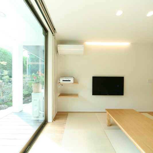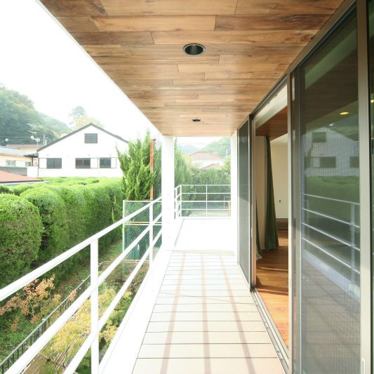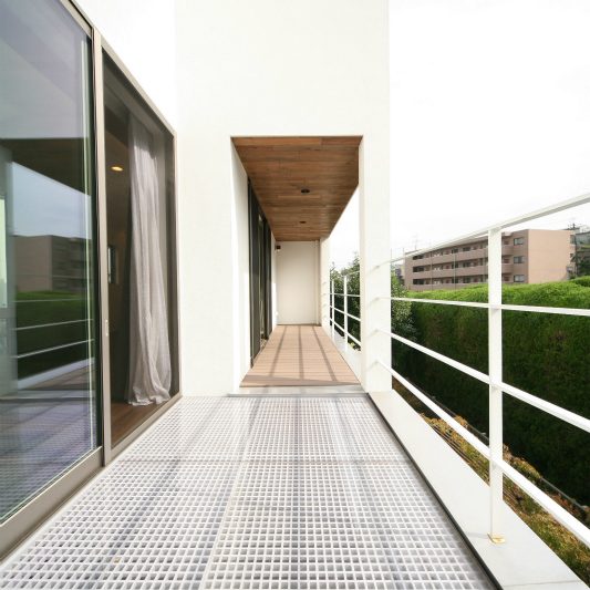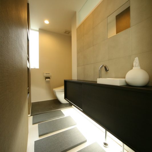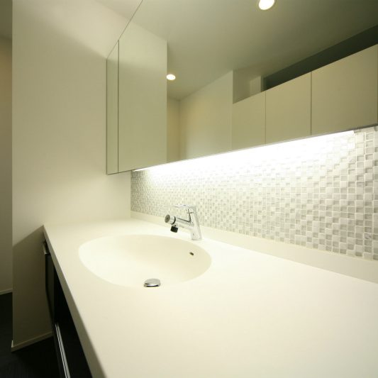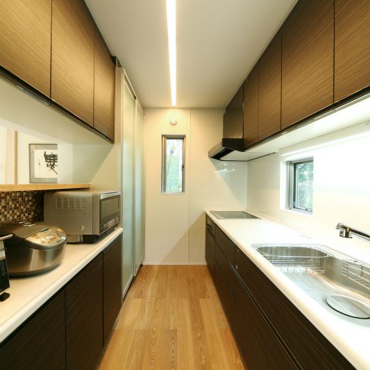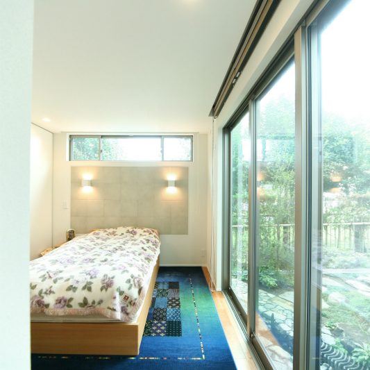 隣が公園であり、周囲を高い木に囲まれているため、開放感のある広い窓を有しつつも、プライバシーは守られています。中庭にも緑を取り入れ、石を多用することで日本伝統の箱庭を表現しました。スクエアをうまく組み合わせることで、スペースを効率的に使用し、LDKを広く確保しています。1階を親世帯、2階を子世帯が使用する2世帯住宅であるため採光を上手くとることで空間につながりを持たせて、家族の気配を感じられる空間に仕上がりました。