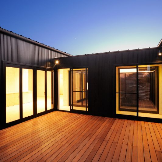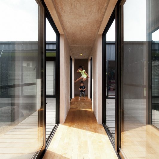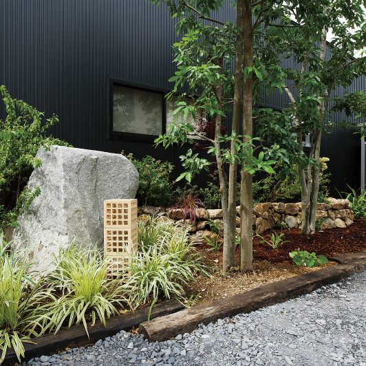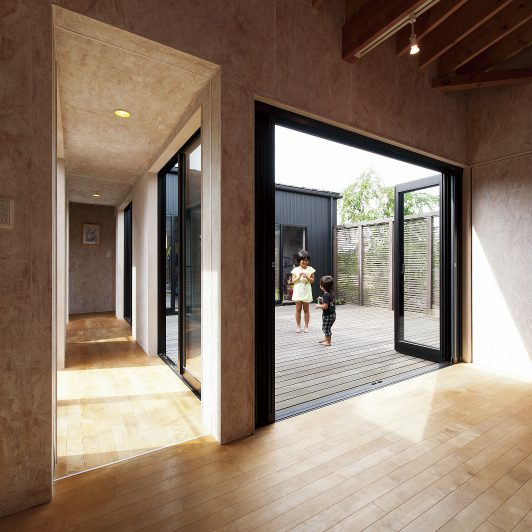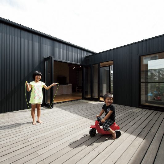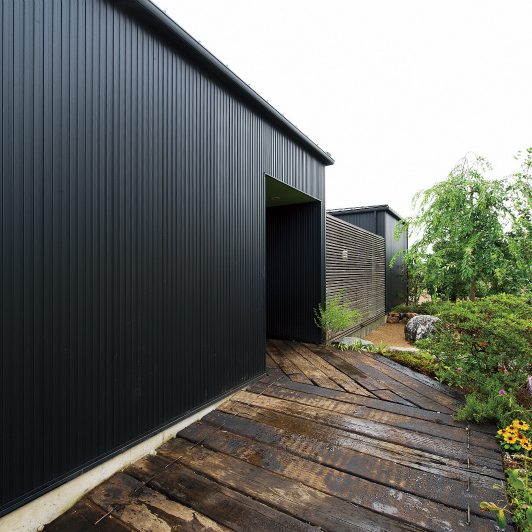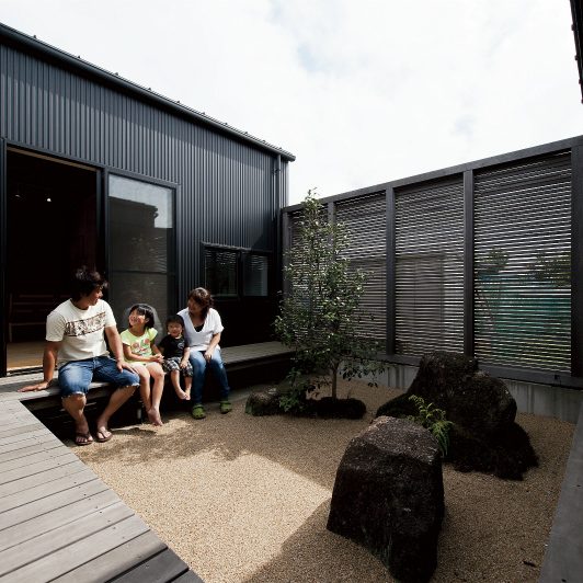 スクエアな黒サイディングがクールな外観から一転、玄関を開けると広がるのは淡い白を基調にしたオープンフロア。さらに視界の先には中庭が2つあり、1つは全面ウッドデッキにして多目的スペースに、もう1つは観賞用にと目的別に振り分けています。中庭の間に渡した通路の先にプライベート空間を集約。もてなし上手のご家族ならではの遊び心と、メリハリある間取りや色使いで笑顔誘う心地良さを表現しました。
